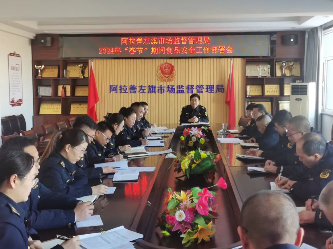 及时召开专题部署会议,传达学习自治区、阿拉善盟关于加强春节期间食品安全专项整治工作要求,制定并印发《关于加强春节期间食品安全监管工作的通知》,明确责任分工,要求各市场监管所及时开展节日市场整治,确保组织得力、任务到人、责任到位,取得实效。