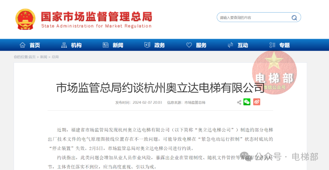 市场监管总局约谈杭州奥立达电梯有限公司