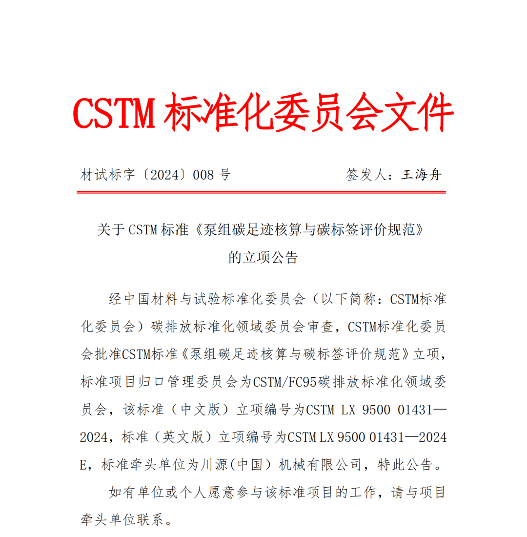 由公司编制,川源(中国)机械有限公司主编的《泵组碳足迹核算与碳标签评价规范》团体标准在中国材料与试验团体标准委员会碳排放领域委员会(FC95)获得立项。