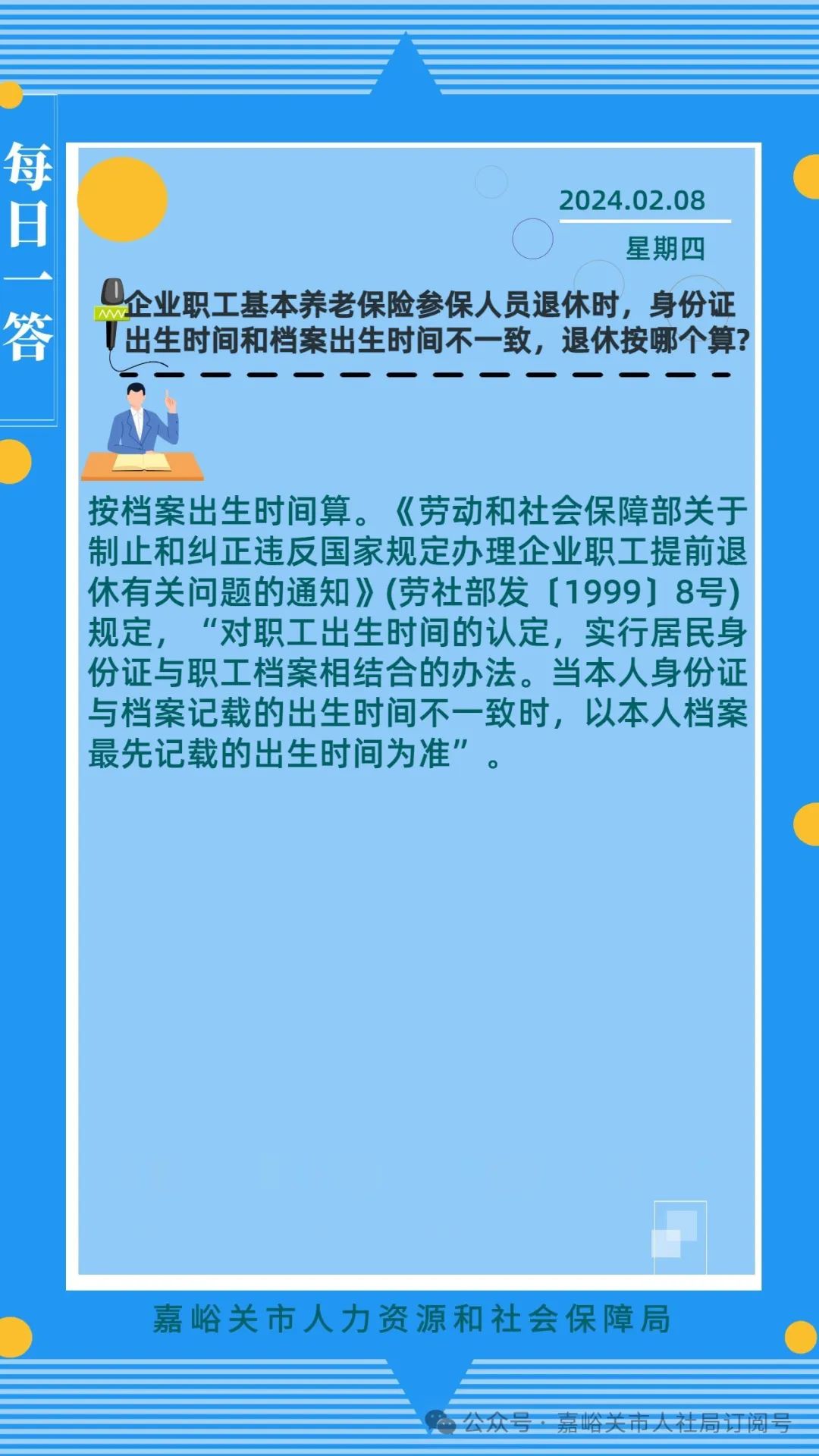 【人社政策每日一答·2月8日】企业职工基本养老保险参保人员退休时,身份证出生时间和档案出生时间不一致,退休按哪个算?