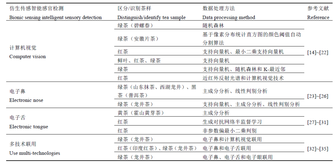 表1. 仿生传感智能感官检测技术在茶叶等级评价中的研究。