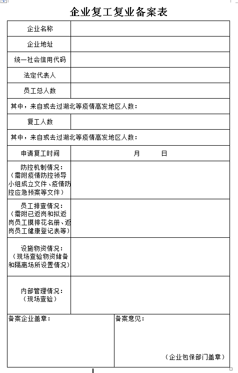 (二)报备需提交的材料:复工复业备案表(附件1)。