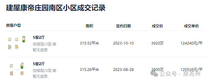 截止目前,康帝庄园二手房成交过2套315㎡,单价12w+,总价3800w+。