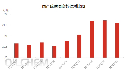 隆众资讯数据显示,2024年1月我国硫磺产量约95.83万吨,环比增长0.58%,同比增长5.55%。前一周期的国内硫磺产量数据约为21.6万吨,环比虽减少0.60%,不过同比却有5.88%的明显增幅。若无意外后续国产硫磺周度产量应都在21万州左右,这就是说即便没有像去年那样有广东石化这样新增产能的释放,此外后续一段时间国内硫磺产量恐因假期期间部分装置的降负荷所导致的相应减产,单靠目前的产能基数依然大概率实现国产周期性的同比增长。