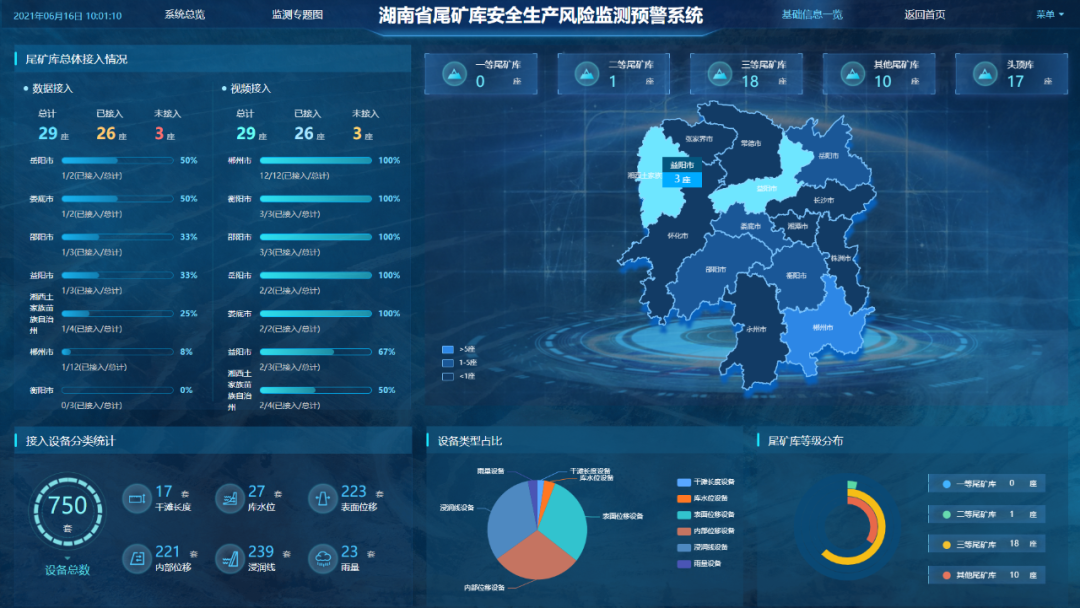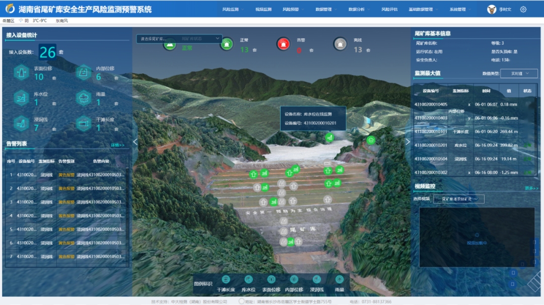 中大检测快速响应号召,构建了具有平台设备接入管理、多源数据采集、数据分析、在线监测、安全监测算法、预警模型管理等核心能力的“省级尾矿库安全生产风险监测平台”。该平台一方面对企业、地市尾矿库相关设备接入,一方面利用公司自主研发的国密算法数据采集终端、传感器、形变雷达等智能感知设备,实现实时采集数据,安全集中管理数据和分析分级预警。