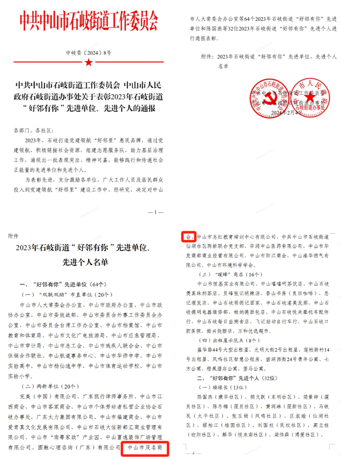 荣获石岐街道2023年度