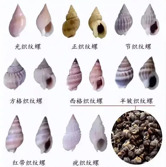 俗称海丝螺、海狮螺、麦螺或白螺等,主要分布于浙江、福建、广东沿海。织纹螺的外形特征表现为尾部较尖,细长,长度约为1厘米左右、宽度约为0.5厘米,约指甲盖大小。