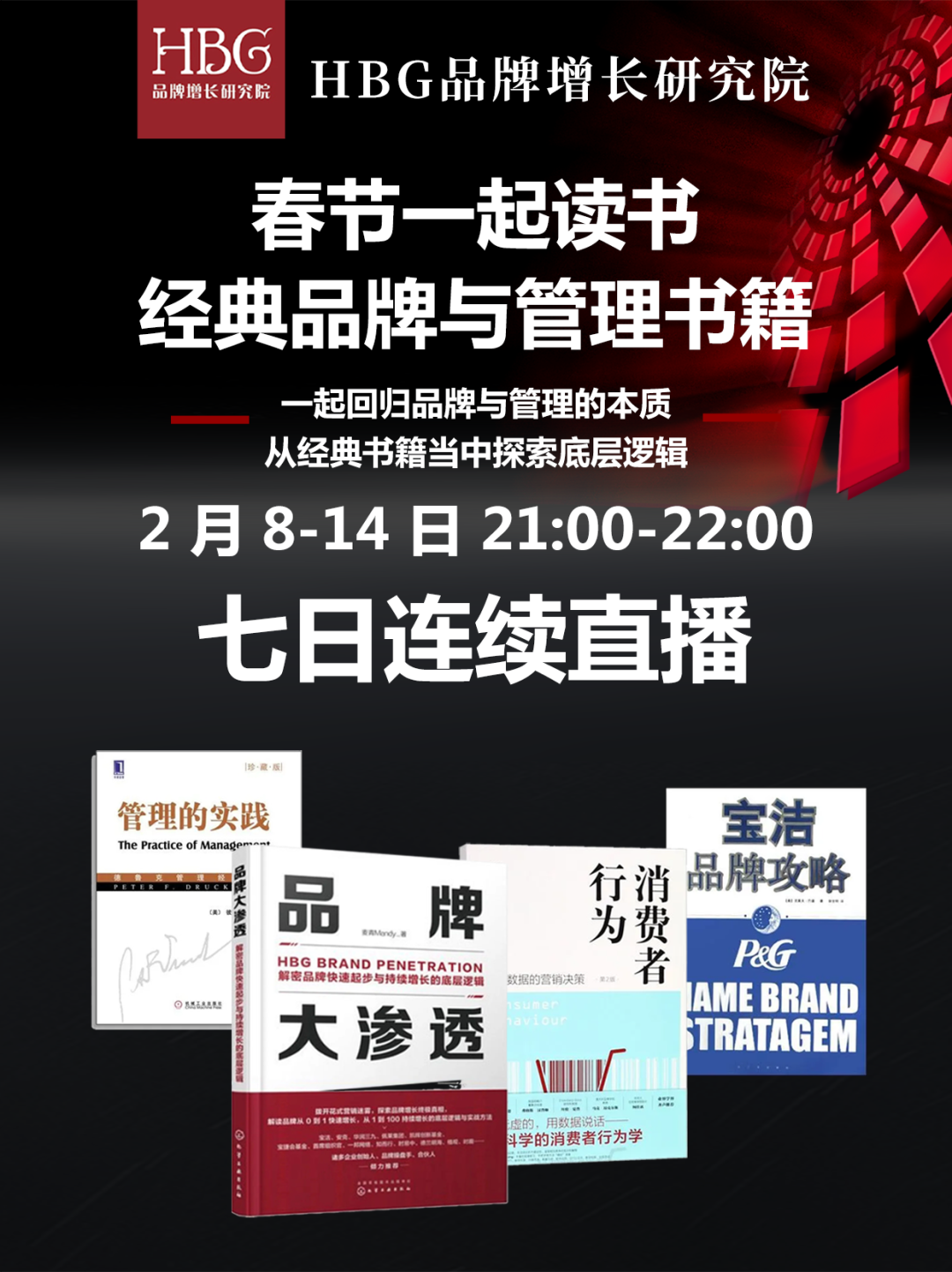 今年春节,采用读书形式,每日晚上9点-10点,HBG院长麦青老师和各位校友一起共同精读4本书:德鲁克《管理的实践》、克莱夫《宝洁品牌攻略》、罗伯特《消费者行为》、麦青《品牌大渗透》。