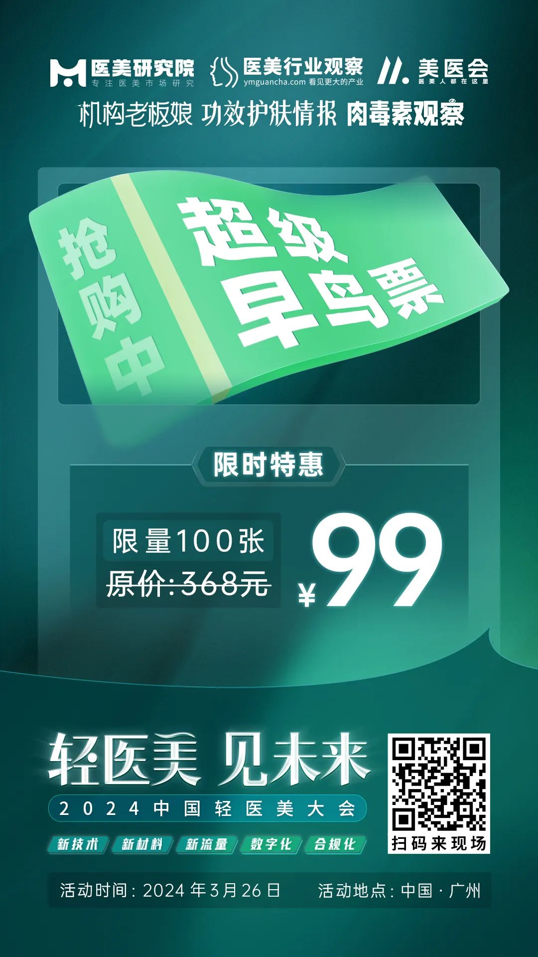 2024年3月26日,由医美行业观察主办的「轻医美 见未来·2024中国轻医美大会」继续约,聚焦“轻医美”、“新材料”、“私域”、“轻抗衰”、“新科技”,解码医美市场新方向,共同预见医美的未来!广州见!