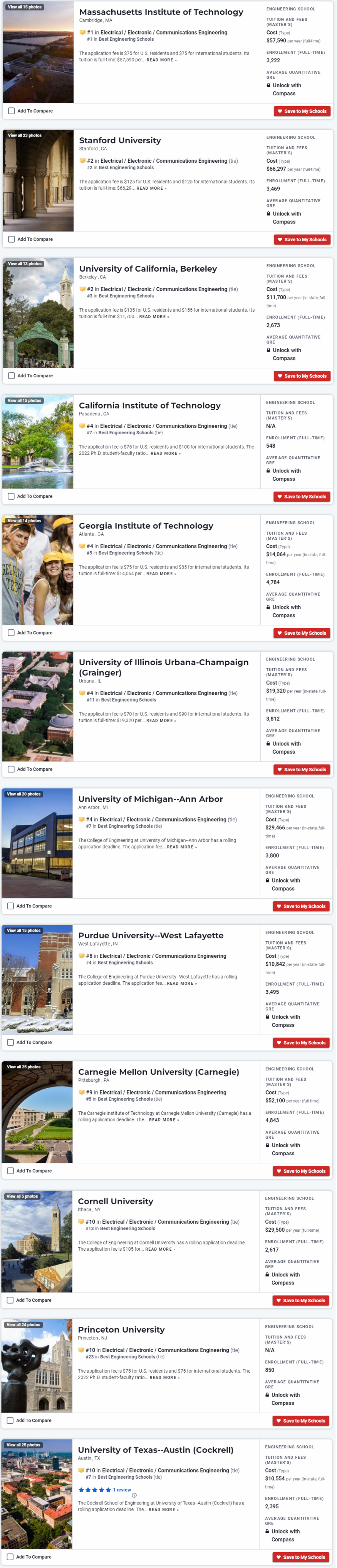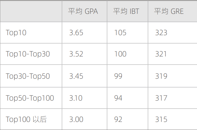 EE由于其竞争激烈度高,顶尖院校项目均对“三围”,即GRE/GPA/TOEFL(如需要),要求颇高,尽管各家class profile不尽相同,但经验上大致三围匹配如下,可以给大家一个粗略的参照系: