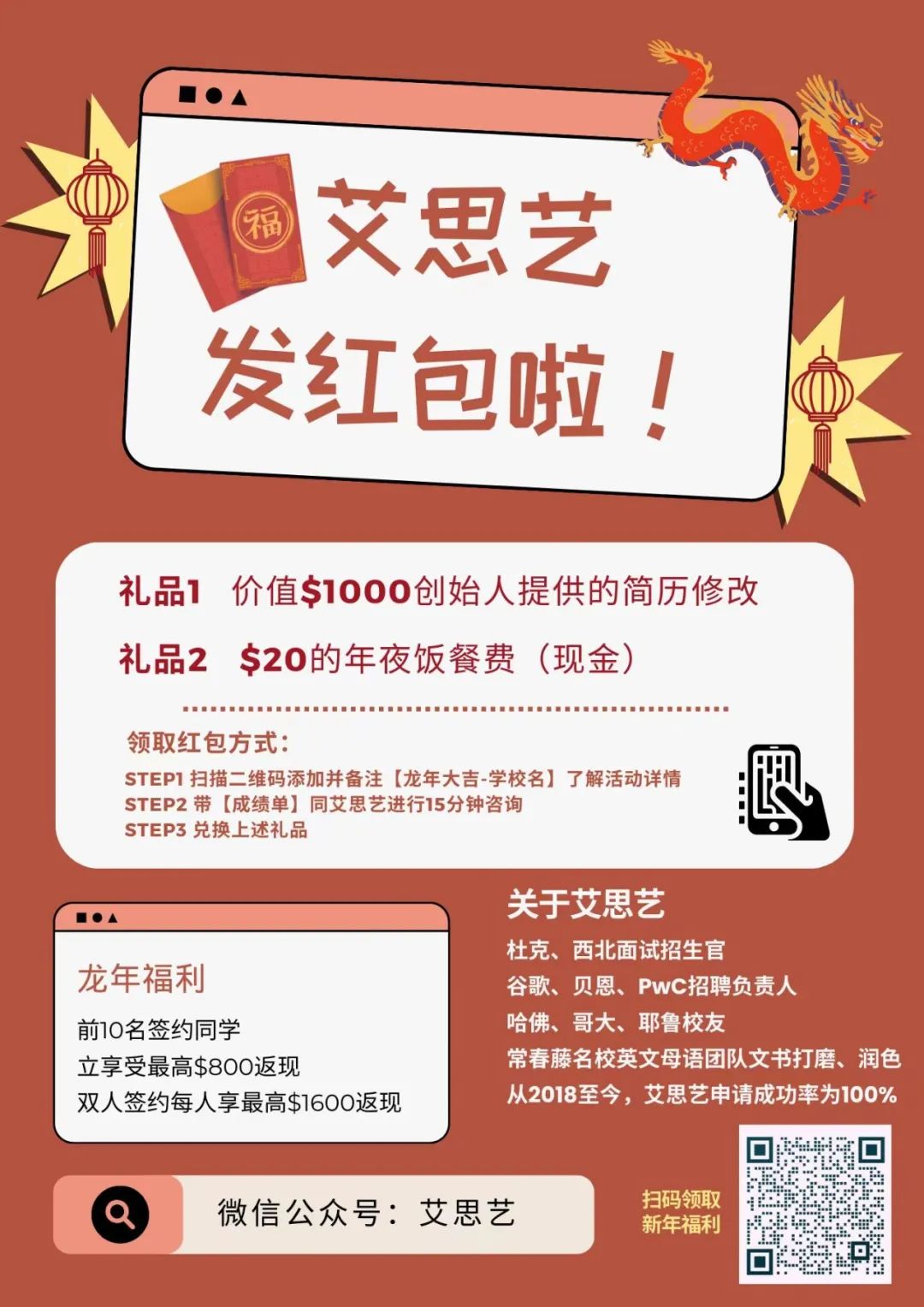 新春来临之际,每位前来咨询的小伙伴都可以领取20$的餐费(现金),还能获得免费简历指导