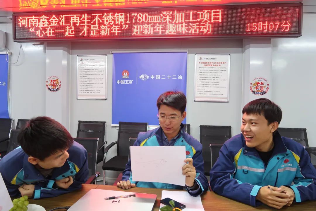 河南鑫金汇项目部举办“心在一起 才是新年”迎新年趣味活动,此次活动融合了娱乐与团队协作元素,进行接力你画我猜,不仅考验了大家的反应能力还考验大家的想象力、绘画能力,大家在一片欢声笑语中点燃新年氛围。