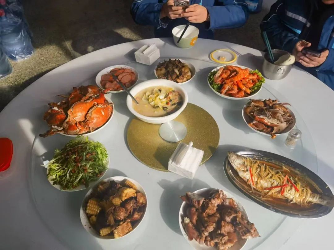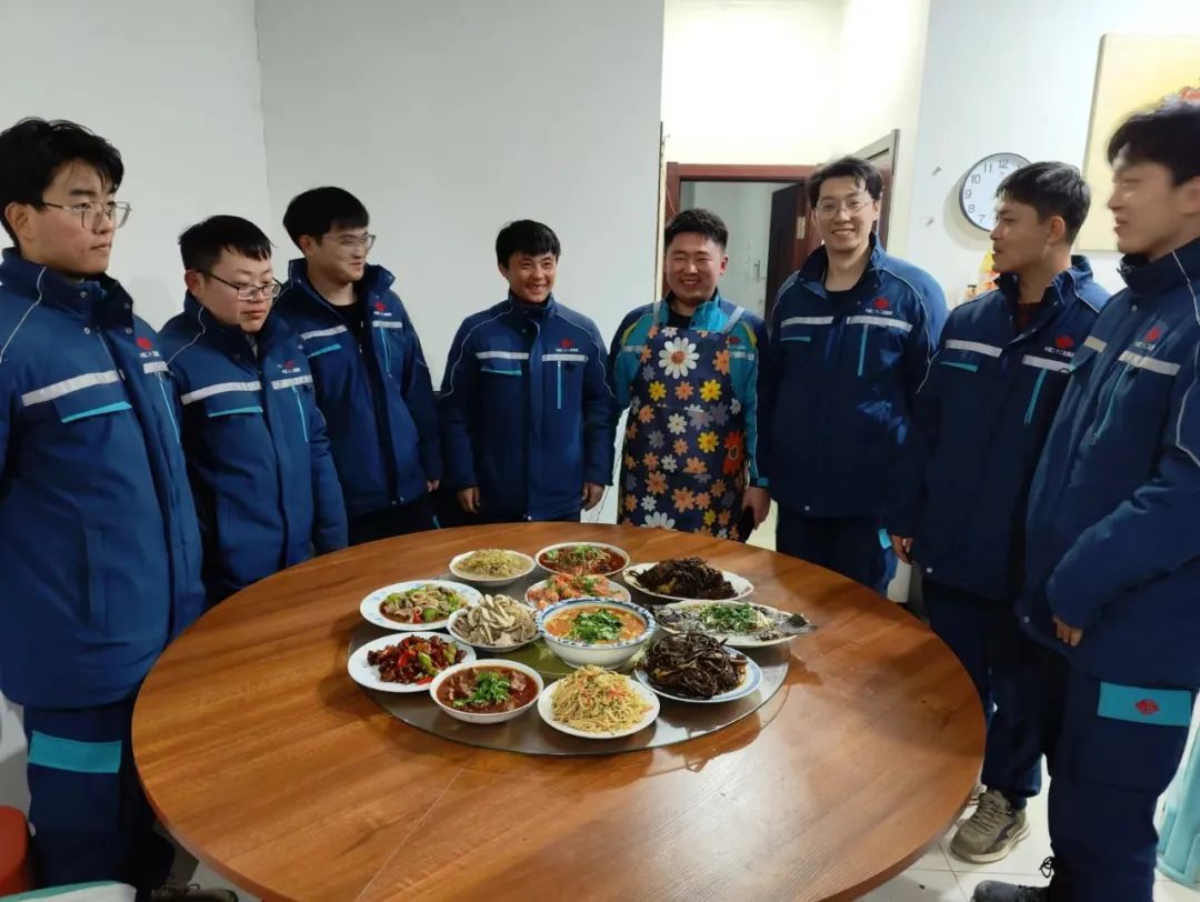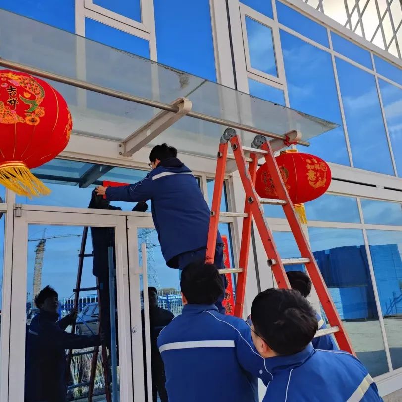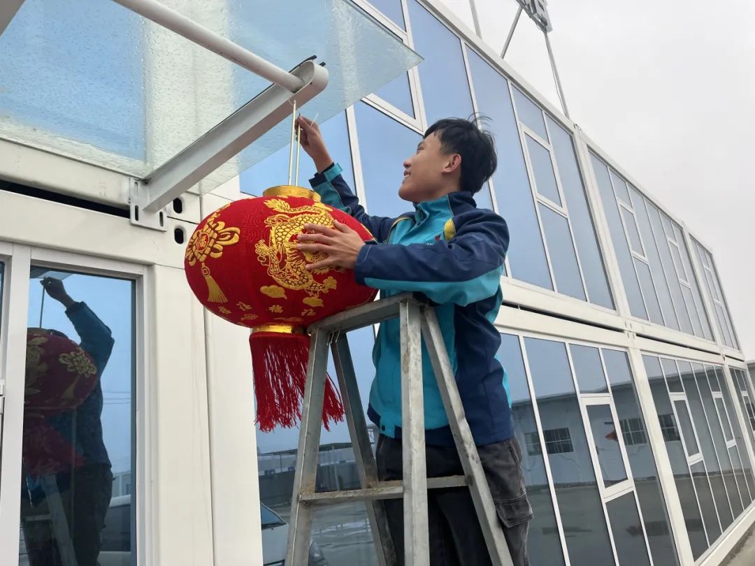 万华化学能源站项目的员工一起为项目部办公楼挂上了红灯笼,贴上了春联和福字。大家聚在一起精心准备了年夜饭,共同庆贺新春佳节。