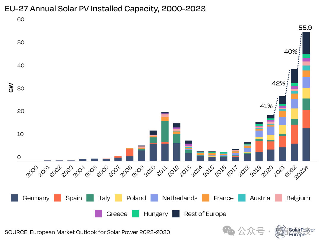 SolarPower Europe发布的最新报告显示,欧洲太阳能装机容量在2023年达到了创纪录的56吉瓦,增长率持续超过40%。