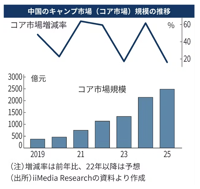 根据中国调研公司艾媒咨询的数据,2021年中国露营经济核心市场的产值为748亿人民币,预计到2025年将增长到2483 亿元。