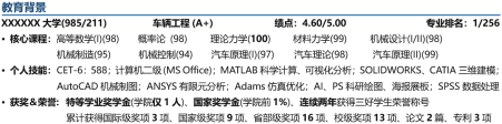 本科学校、专业等这些基本信息,建议字体加粗,方便老师阅读。本科学校如果是985/211或者双一流类学校,标注出来,如果不是就不标。如果本科专业学科评估等级比较高,大家一定要标注出来,这是重要优势之一,格式例如“车辆工程(A+)”。