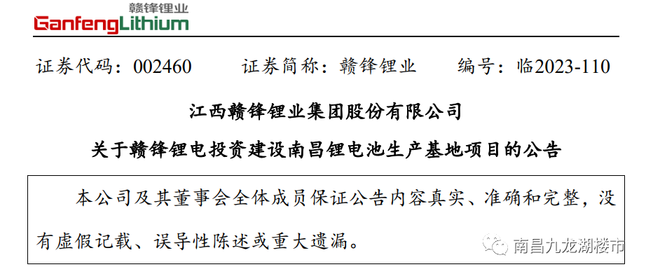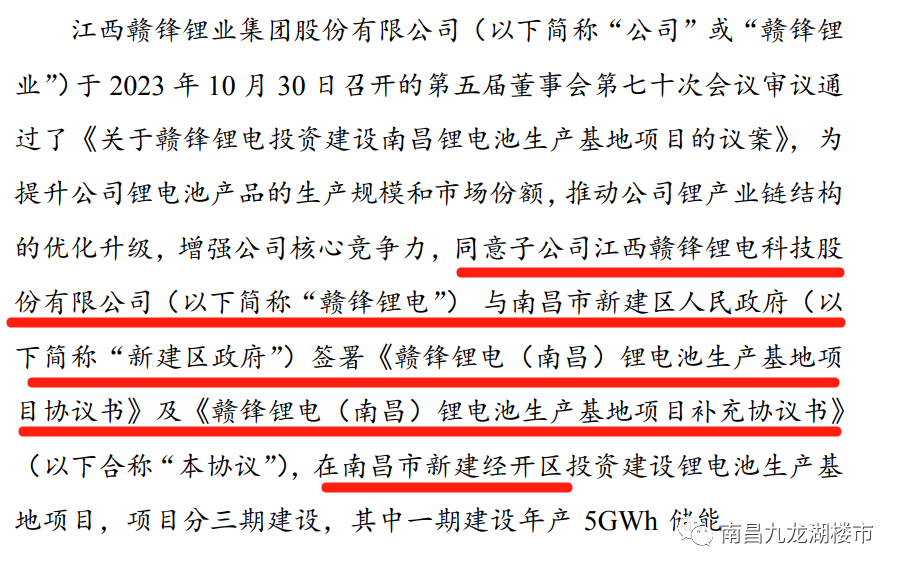江西赣锋锂业集团股份有限公司发布了关于赣锋锂电投资建设南昌锂电池生产基地项目的公告。其中披露,于2023年10月30日召开的第五届董事会第七十次会议审议通 过了《关于赣锋锂电投资建设南昌锂电池生产基地项目的议案》,为提升公司锂电池产品的生产规模和市场份额,推动公司锂产业链结构的优化升级,增强公司核心竞争力,同意子公司江西赣锋锂电科技股份有限公司(以下简称“赣锋锂电”) 与南昌市新建区人民政府(以 下简称“新建区政府”)签署《赣锋锂电(南昌)锂电池生产基地项 目协议书》及《赣锋锂电(南昌)锂电池生产基地项目补充协议书》 (以下合称“本协议”),在南昌市新建经开区投资建设锂电池生产基地项目。项目分三期建设,其中一期建设年产 5GWh 储能PACK 电池生产基地,计划投资金额不超过20 亿元人民币,;项目二期、三期根据市场情况适时启动动力电池、储能电池生产基地的投资建设,存在一定的不确定性,项目资金来源为赣锋锂电自筹。江西赣锋锂电科技股份有限公司一期项目名称为年产 5GWh 储能 PACK 电池生产基地。投资金额。一期年产 5GWh 储能 PACK 电池生产基地计划投资金额不超过 20 亿元人民币,该投资金额仅为初步测算的投资金额上限,项目投资金额与项目建设内容等有关,具体以实际投入为准。一期项目拟建设内容包括建设年产 5GWh 储能 PACK 电池产线及其他配套附属工业设施。2024年12月项目(一期)实现主体工程竣工,2025年6月试投产。项目选址在新建经开区规划范围内,规划总用地约 600 亩, 其中项目(一期)规划用地约150亩,具体位置和面积以实际测绘图 纸为准。项目用地性质为工业用地,最终规划用地指标应该符合区自然资源部门的相关规定要求,并以政府部门批准的控制性详细规划为准。