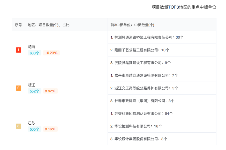 2、【全国】【桥梁】 项目数量 TOP3 地区的重点中标单位;