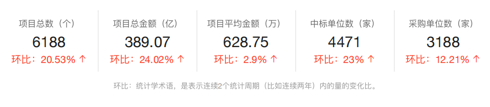 市场主体方面,本年中标企业总数为4471家,环比上年增长23%;完成招标采购的采购单位总数3188家,环比上年增长12.21%;