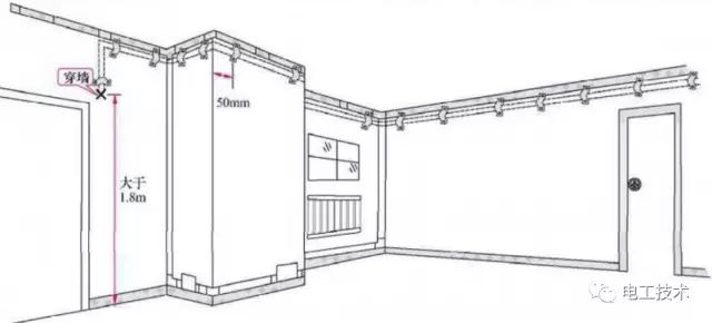明敷指导线沿着墙壁、天花板、柱子等在建筑物表面进行敷设的方法。