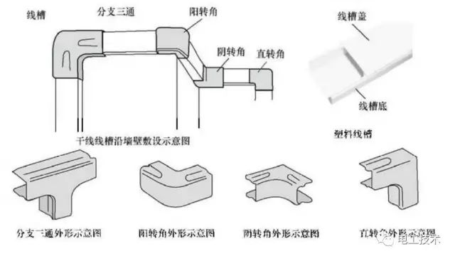 在敷线的同时,边敷线边将盖板固定在底板上,盖板与底板的接口应相互错开。塑料板槽的配套部件主要有分支三通、阳转角、阴转角及直转角。