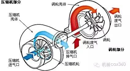 涡轮增压装置主要是由涡轮室和增压器组成。首先是涡轮室的进气口与发动机排气歧管相连,排气口则接在排气管上。然后增压器的进气口与空气滤清器管道相连,排气口接在进气歧管上,最后涡轮和叶轮分别装在涡轮室和增压器内,二者同轴刚性联接,这样一个整体的涡轮增压装置就做好。