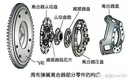 离合器位于发动机和变速箱之间的飞轮壳内,用螺钉将离合器总成固定在飞轮的后平面上,离合器的输出轴就是变速箱的输入轴。在汽车行驶过程中,驾驶员可根据需要踩下或松开离合器踏板,使发动机与变速箱暂时分离和逐渐接合,以切断或传递发动机向变速器输入的动力。