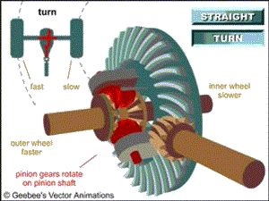 汽车差速器能够使左、右(或前、后)驱动轮实现以不同转速转动的机构。主要由左右半轴齿轮、两个行星齿轮及齿轮架组成。功用是当汽车转弯行驶或在不平路面上行驶时,使左右车轮以不同转速滚动,即保证两侧驱动车轮作纯滚动运动。