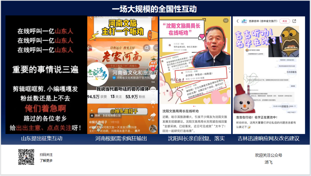 在接住这泼天富贵的路上,各地文旅姿势整齐划一,从“质疑尔滨、理解尔滨、成为尔滨”,甚至“超越尔滨”。大家活跃在互联网上花式整活,通过“发疯、听劝、秀真诚”三大招式制造出一个又一个话题,热度居高不下。