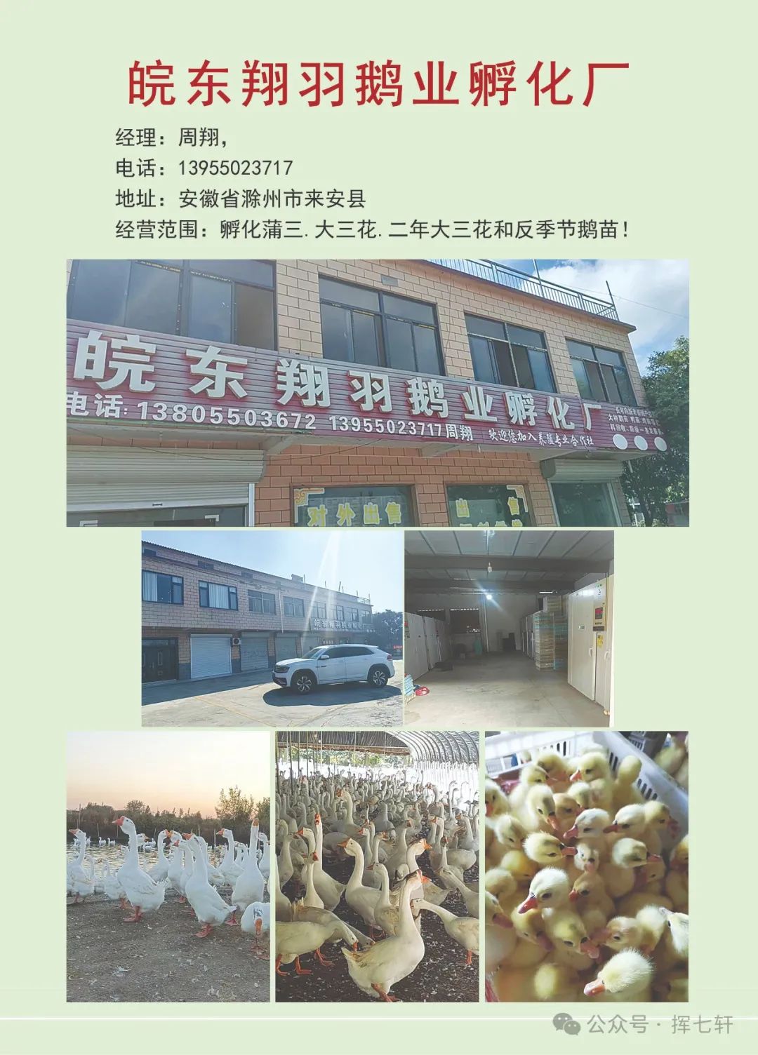熊光旭 | 蚌埠市华信禽业 | 18909622981 | 孵化和培育大品种鹅苗 |