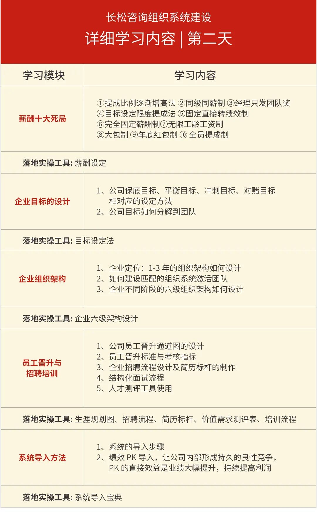 本次企业管理系统咨询会将邀请到一位实战派嘉宾,围绕管理系统的组织系统进行分享,其中组织系统七大板块分 别是:组织架构、工作分析、薪酬设计、绩效考核、生涯规划、培训系统、招聘系统。