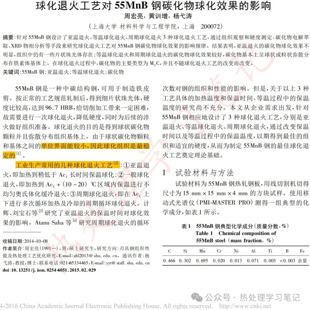 周宏亮,黄训增,杨弋涛. 球化退火工艺对55MnB钢碳化物球化效果的影响 [J]. 金属热处理, 2015, 40 (02): 135-140.