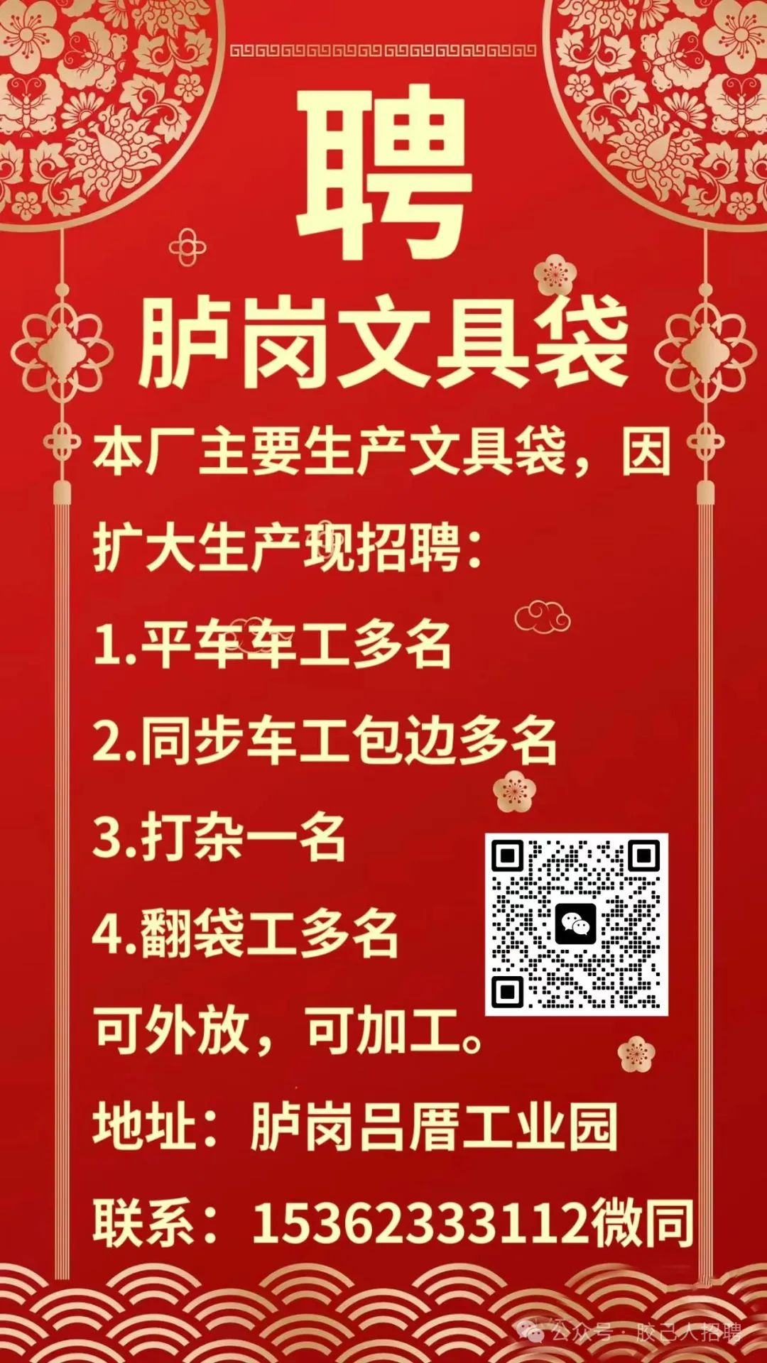 【胪岗文具袋】可外放.可加工.招聘1.平车车工2.同步车工包边3.打杂4.翻袋工,地址:吕厝工业园.联系:15362333112