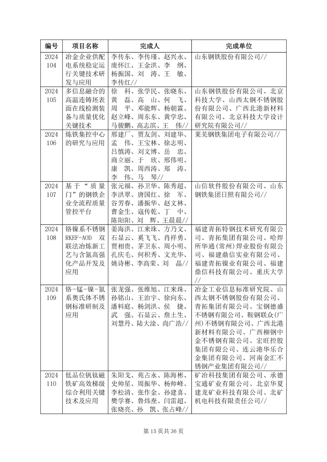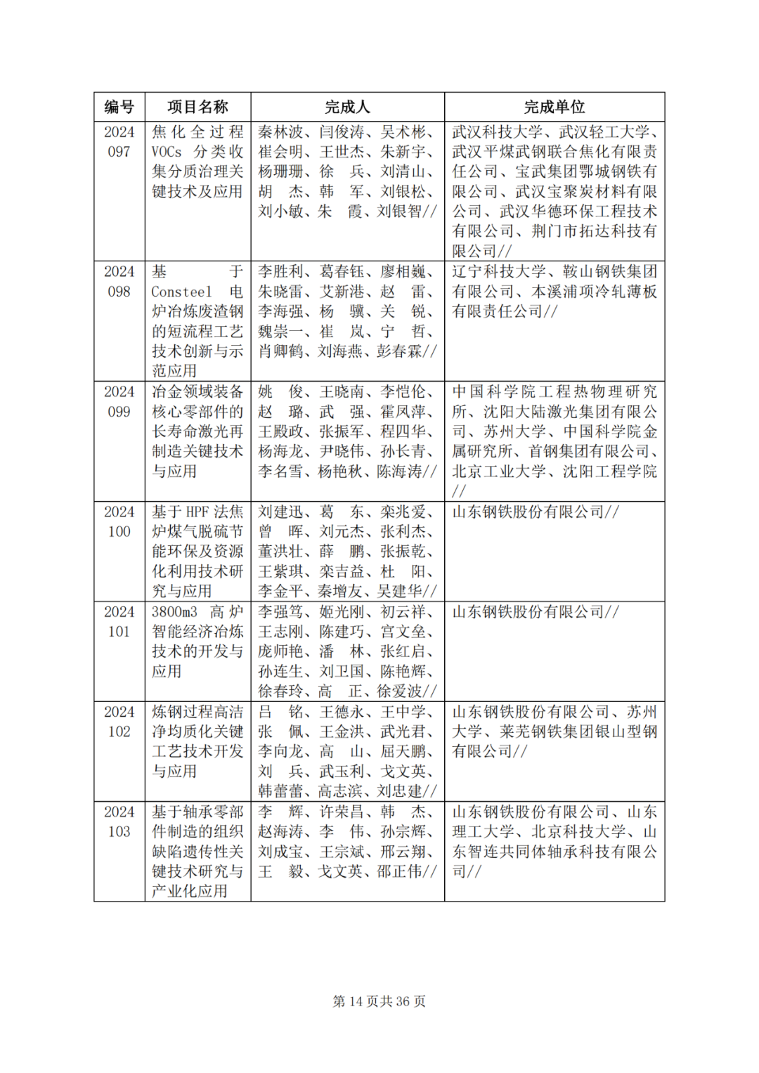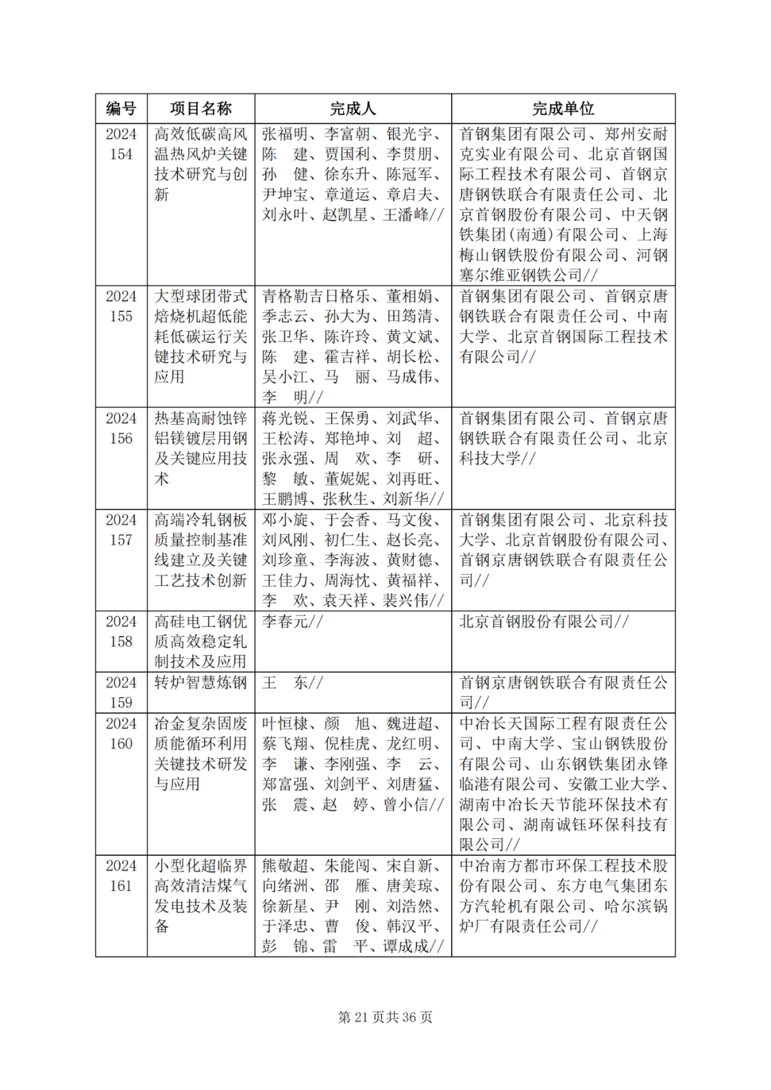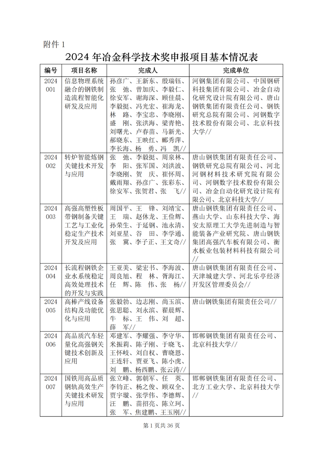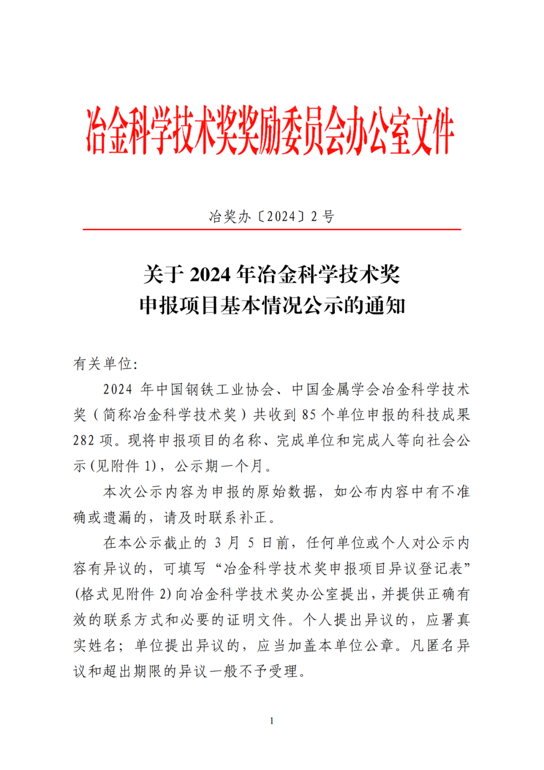 2024年中国钢铁工业协会、中国金属学会冶金科学技术奖(简称冶金科学技术奖)共收到85个单位申报的科技成果282项。现将申报项目的名称、完成单位和完成人等向社会公示(见附件1),公示期一个月。