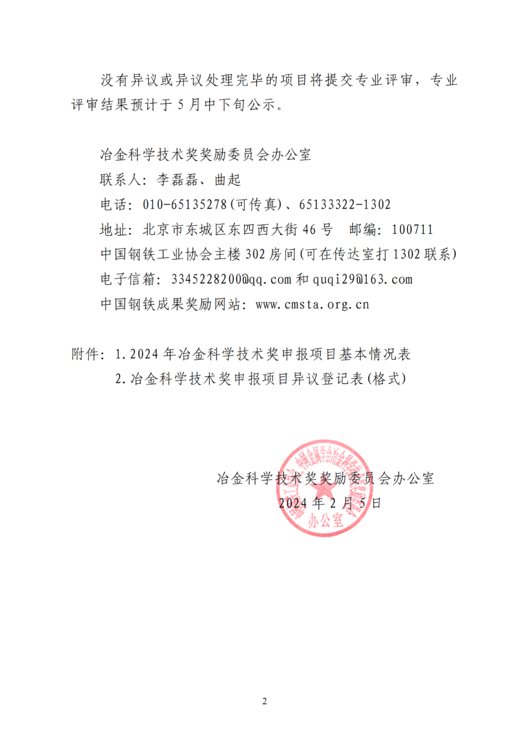 在本公示截止的3月5日前,任何单位或个人对公示内容有异议的,可填写“冶金科学技术奖申报项目异议登记表”(格式见附件2)向冶金科学技术奖办公室提出,并提供正确有效的联系方式和必要的证明文件。个人提出异议的,应署真实姓名;单位提出异议的,应当加盖本单位公章。凡匿名异议和超出期限的异议一般不予受理。
