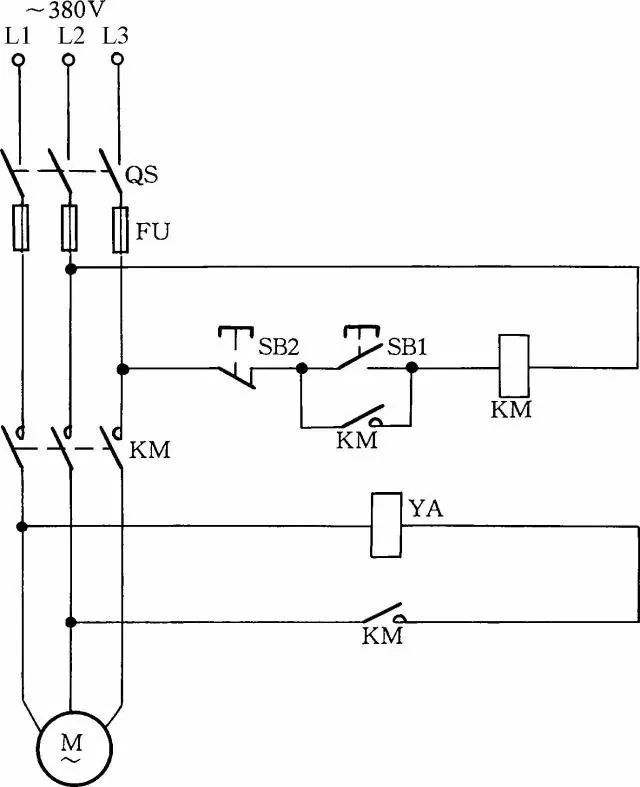 线路中 YA 为制动电磁铁,在通电后,制动解除;在断电后,YA 立即制动。
