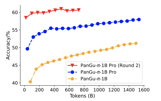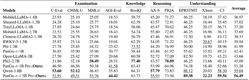 基于上述策略,作者构建了两个 PanGu-π-1B Pro 和 PanGu-π-1.5B Pro。与类似规模的模型相比,取得了更优的效果。