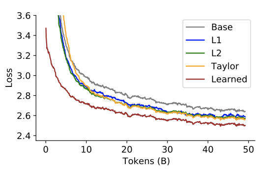 在每个层内部,可以用各种度量函数来评估参数的重要性,包括权重的范数、泰勒展开式、数据驱动可学的度量等。下图比较了使用不同度量选择参数后模型训练效果和收敛速度。使用数据驱动学习的度量是最有效的,可以从较好的起点开始,以更快的速度收敛到更低的 loss 值。