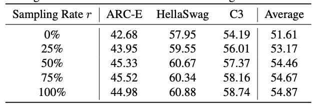 为了降低多轮训练的成本,可以使用第一轮的训练 loss 来做数据筛选和精炼,优先选择 loss 大的数据送入第二轮。用 r 表示第 2 轮训练时样本的采样率,可以发现当采样率超过 50% 时,模型效果的提升比较小。