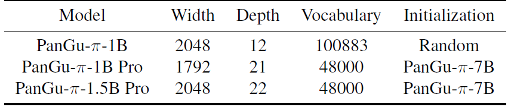 PanGu-π-1B 和 PanGu-π-1.5B 的结构设定