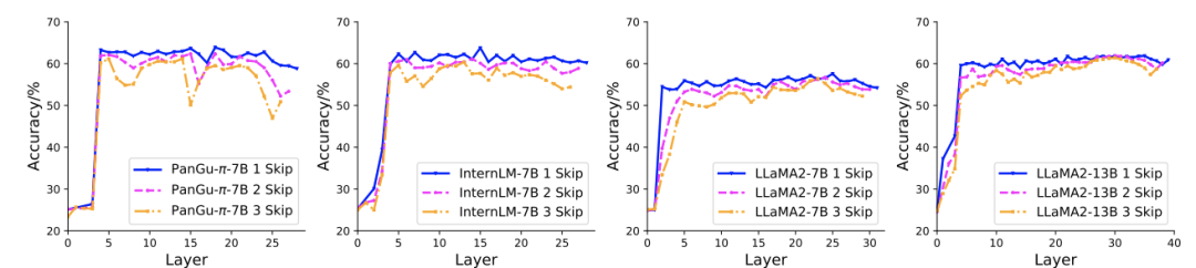 作者首先验证了模型各个层的重要性。对于 LLaMA2-7B、LLaMA2-13B、InternLM-7B 和 PanGu-π-7B 等多个大模型,作者跳过了一些层,来观察跳过后模型效果的变化。不同模型都展现出类似的规律:越靠近模型两端的层对模型效果的影响最大,删除一些中间层对模型效果影响较小。因此参数继承时,可以删除大模型部分中间层,来对齐大小模型的深度。
