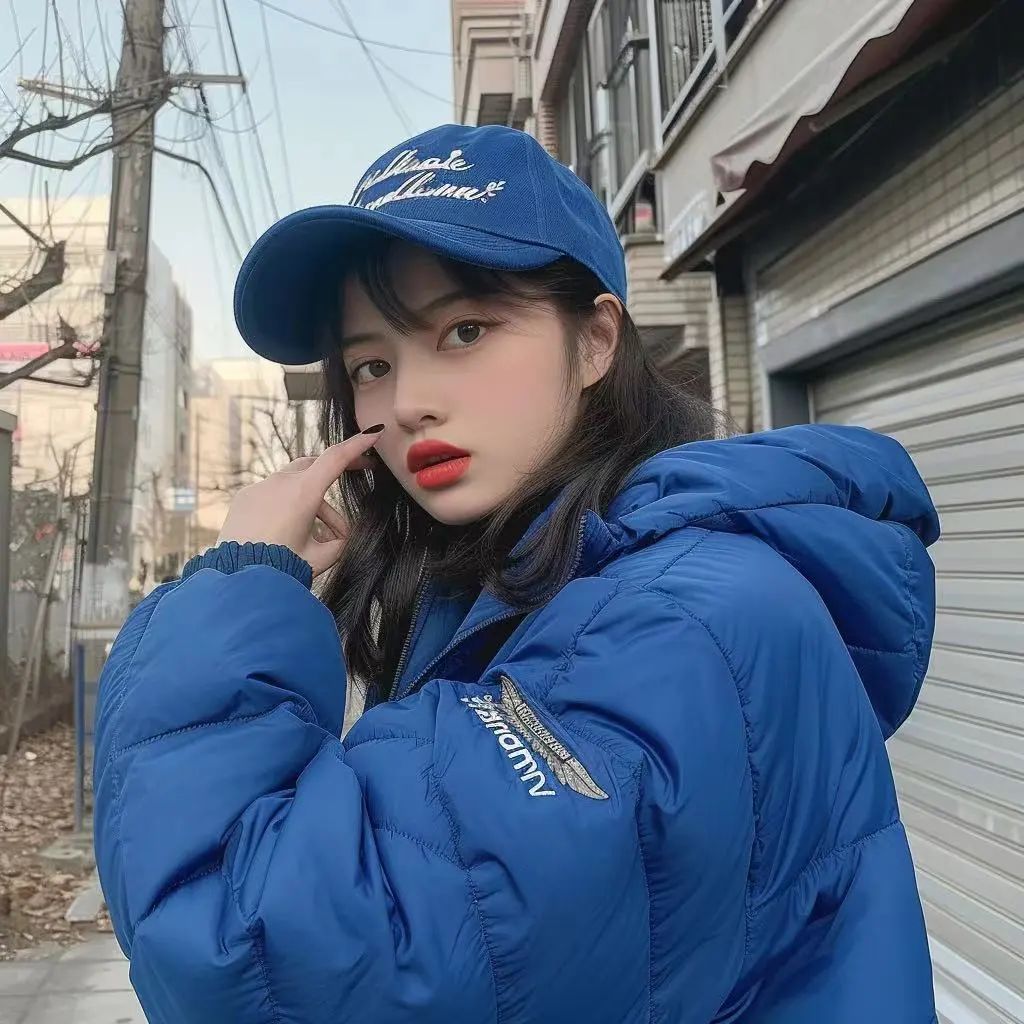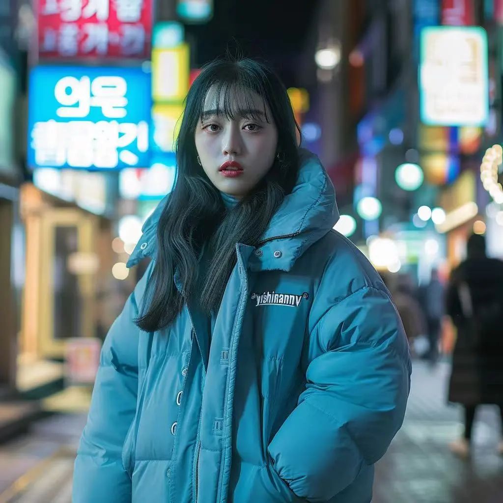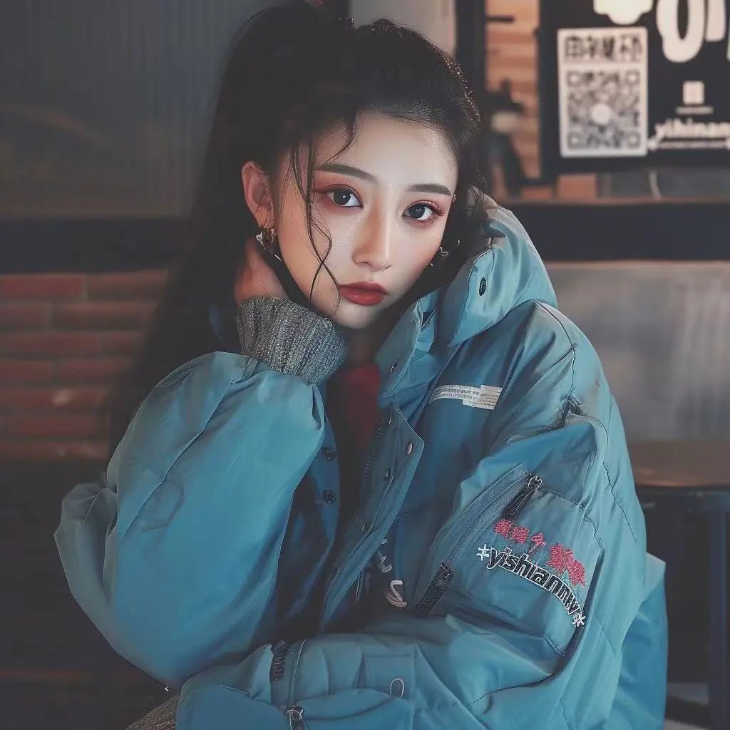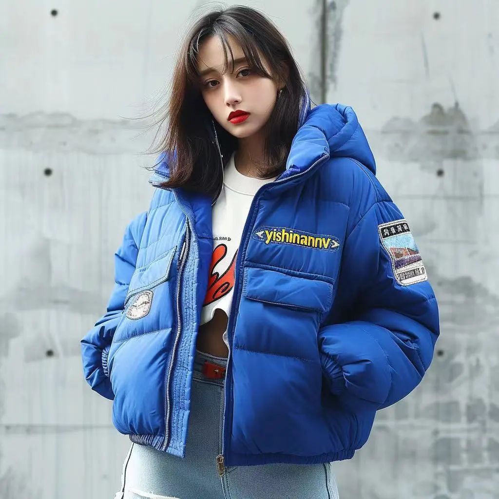 <1 Girl>Wearing<Style: Fashion and Leisure>From a brand called "<yishinannv>", the brand name is embroidered on<Position: Sleeve Mouth>.< Blue down jacket>-- ar 2:3-- Original style -- v 6