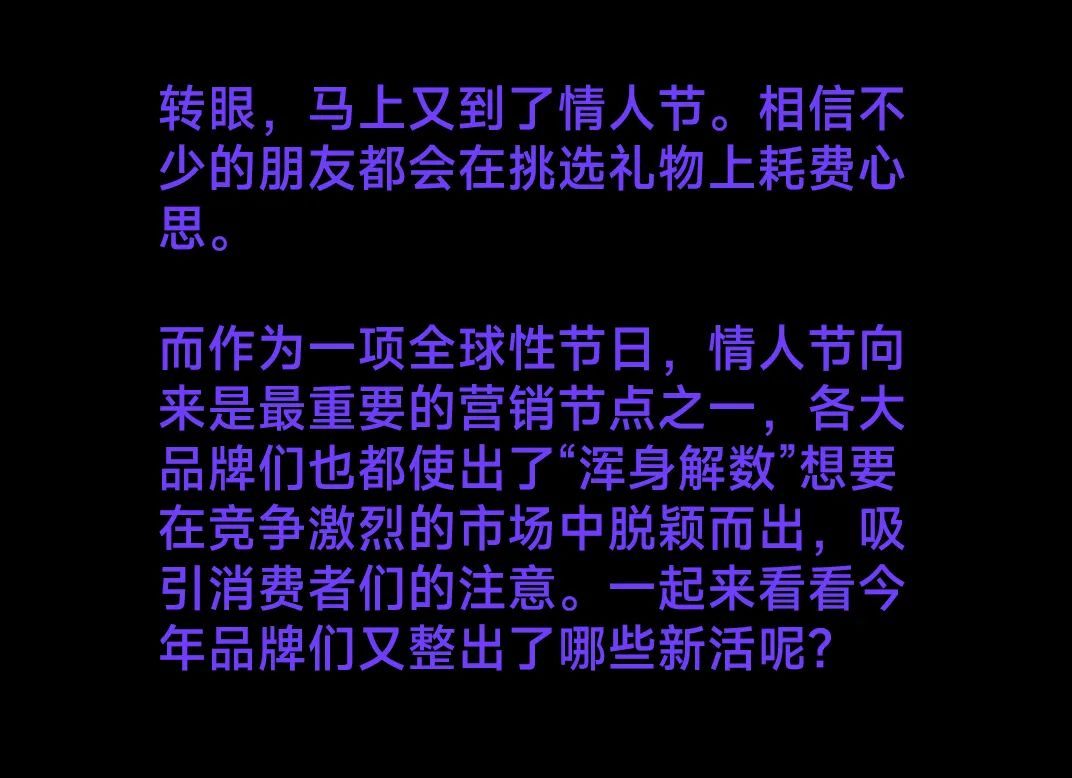 每年一度的情人节也仿佛品牌们的一次开卷考试,在消费者们的口味已经被惯坏的当下,竭尽所能的引爆社群,顺利出圈。而这次哪个品牌又戳中你的心巴?