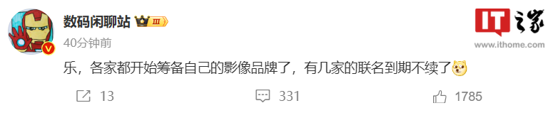 据博主 @数码闲聊站 今日爆料,“各家(手机厂商)都开始筹备自己的影像品牌了,有几家的联名到期不续了”。遗憾的是,该博主并没有透露具体厂商。