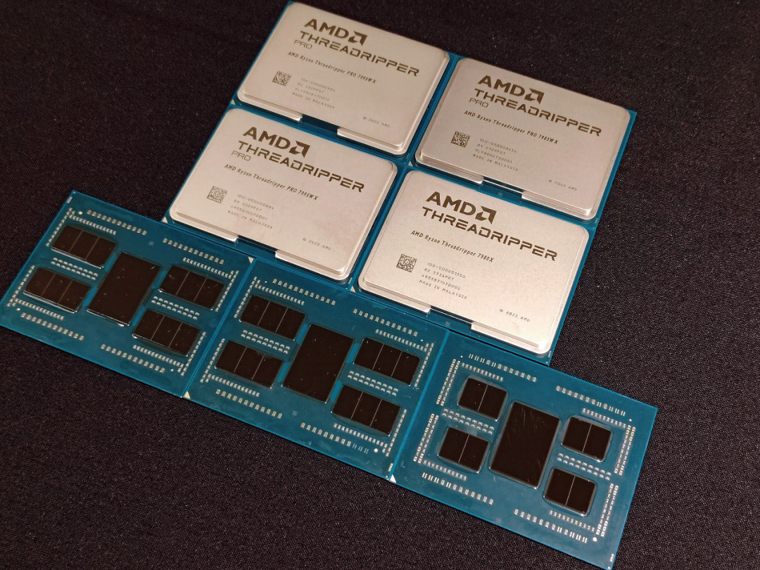 ?靠左的两颗处理器为锐龙线程撕裂者Pro 7995WX,可见它内置了12个CCD,最右侧为锐龙线程撕裂者7980X,它的内部左右各布置了4个CCD,围绕着中间的IOD(I/O功能芯片)。