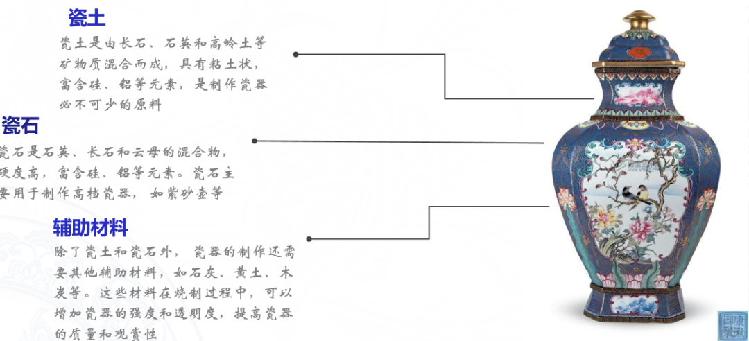 总之,瓷器的原材料是多种矿物质混合而成,其中瓷土是最重要的原料。制作瓷器需要高温烧制, 需要大量的辅助材料来提高瓷器的品质。