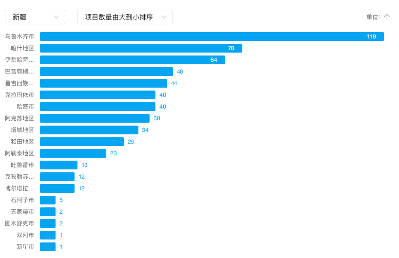 本年,新疆无人机领域招投标项目数量方面,乌鲁木齐市、喀什地区、伊犁 哈萨克自治州中标项目较多,分别达到119个、70个、64个,前3个城市占新疆无人机领域项目数量的41.41%。