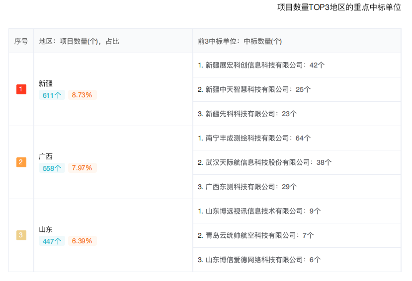 2、【全国】【无人机】 项目数量 TOP3 地区的重点中标单位;