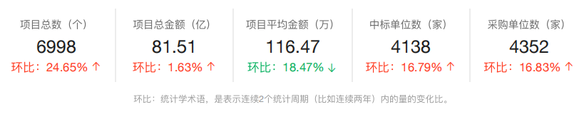 市场主体方面,本年中标企业总数为4138家,环比上年增长16.79%;完成招标采购的采购单位总数4352家,环比上年增长16.83%;