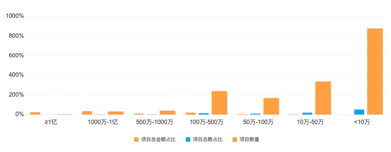 2023年,全国无人机领域招投标项目金额落在<10万的项目最多,占项目总量的42.16% 。项目金额落在≥1亿的项目总金额最高,占总项目金额的41.54% 。项目金额结构占比如下图: